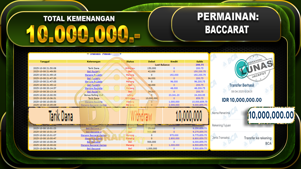 Bukti JP Baccarat – ucapkan selamat kepada user id asuxxxxxx atas kemenangan di Baccarat dengan total kemenangan Rp.10.000.000- . Yang pasti nya langsung LUNAS sesuai bukti ya bosku. Dorahoki nih bosku berapapun akan tetap kami bayar lunas ya bosku.