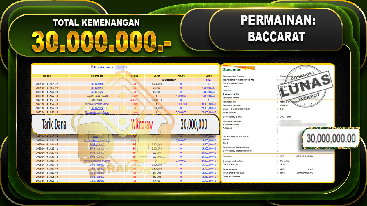 Bukti JP Baccarat – ucapkan selamat kepada user id arkhxxxx atas kemenangan di Baccarat dengan total kemenangan Rp.30.000.000- . Yang pasti nya langsung LUNAS sesuai bukti ya bosku. Dorahoki nih bosku berapapun akan tetap kami bayar lunas ya bosku.