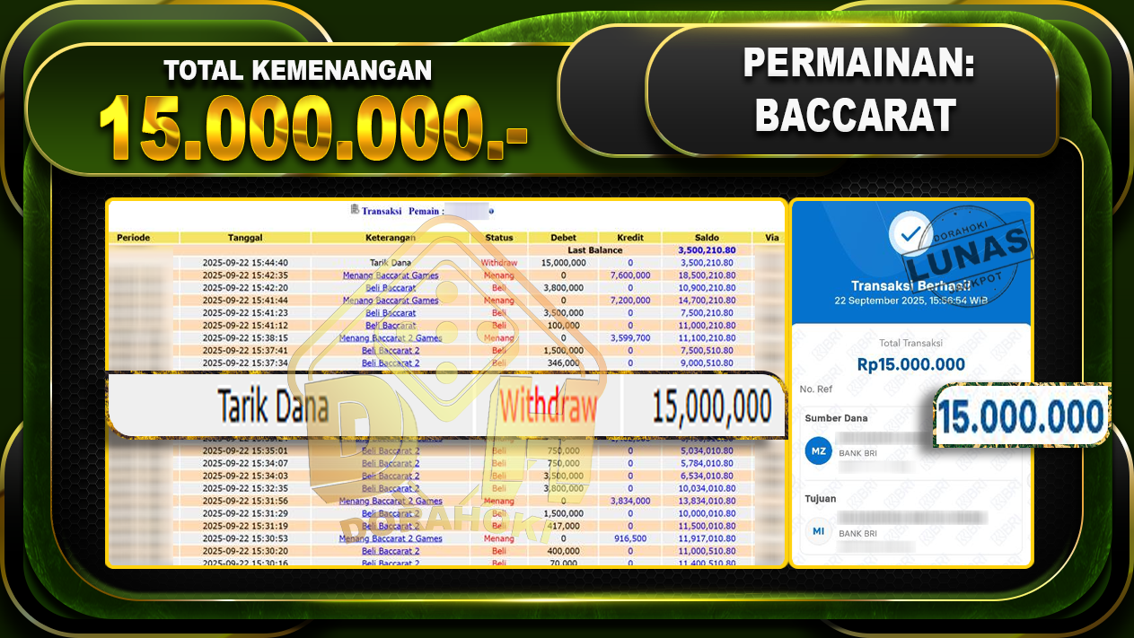 Bukti JP Baccarat – ucapkan selamat kepada user id Arkxxxxx atas kemenangan di Baccarat dengan total kemenangan Rp.15.000.000- . Yang pasti nya langsung LUNAS sesuai bukti ya bosku. Dorahoki nih bosku berapapun akan tetap kami bayar lunas ya bosku.
