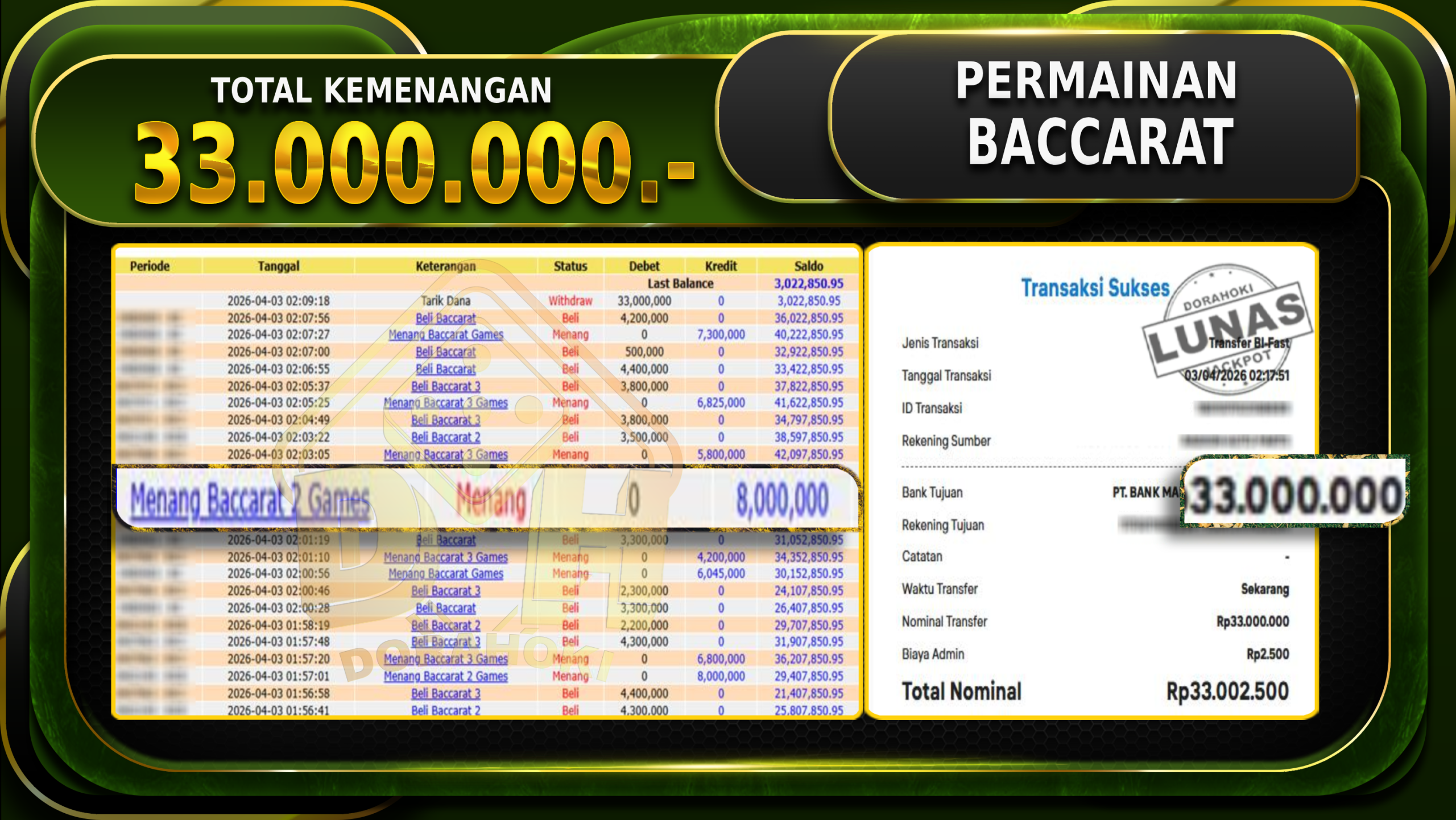 Bukti JP BACCARAT GAMES – ucapkan selamat kepada user id Ctpxxx atas kemenangan di BACCARAT GAMES dengan total kemenangan Rp.33.000.000,- . Yang pasti nya langsung LUNAS Sesuai Bukti.