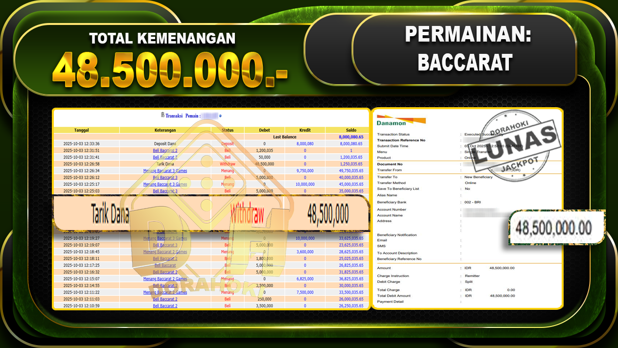 Bukti JP BACCARAT – ucapkan selamat kepada user id arkxxxxxx atas kemenangan di BACCARAT dengan total kemenangan Rp.48.500.000,- . Yang pasti nya langsung LUNAS sesuai bukti ya bosku. Dorahoki nih bosku berapapun akan tetap kami bayar lunas ya bosku.