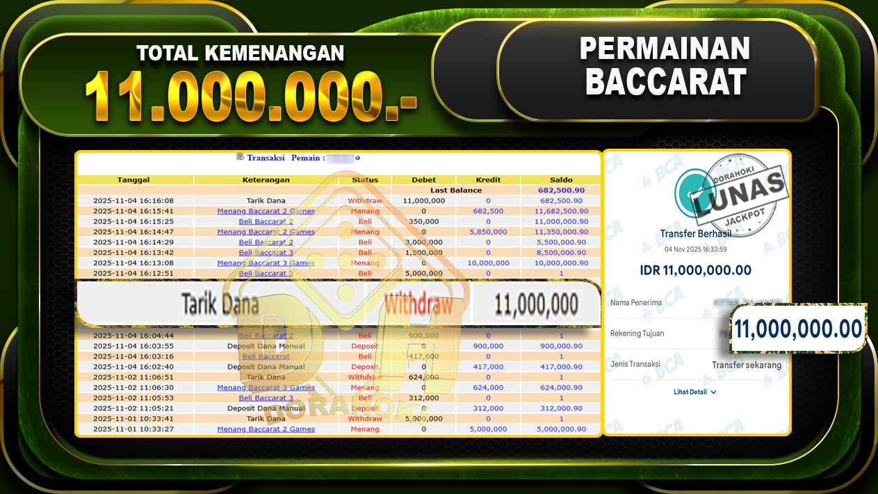 Bukti JP BACCARAT – ucapkan selamat kepada user id olsxxx atas kemenangan di BACCARAT dengan total kemenangan Rp.11.000.000,- . Yang pasti nya langsung LUNAS sesuai bukti ya bosku. Dorahoki nih bosku berapapun akan tetap kami bayar lunas ya bosku.