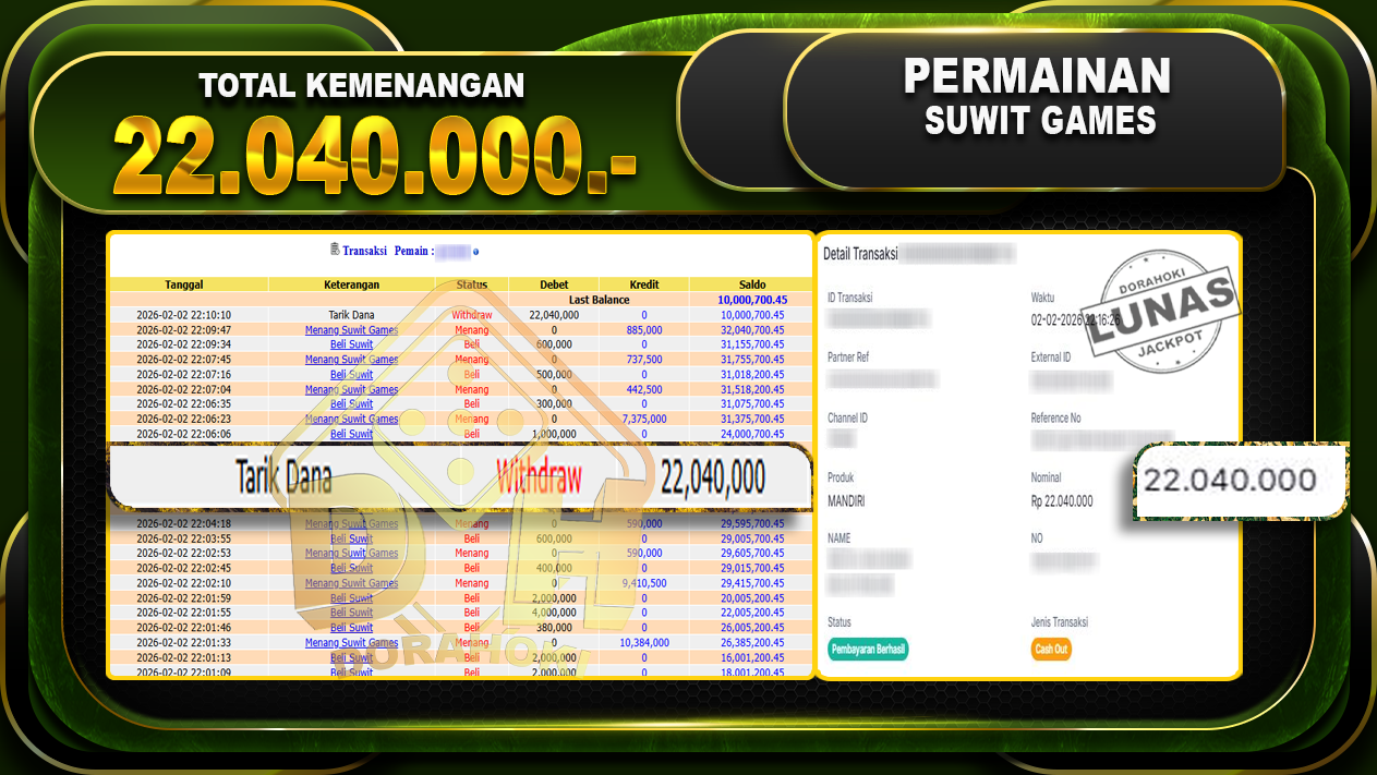 Bukti JP Suwit Games – Selamat Kepada User ID : busxxx atas kemenangan Suwit Games Dengan Nominal Sebesar Rp.22.040.000,- . Yang pasti nya langsung LUNAS Sesuai Bukti.