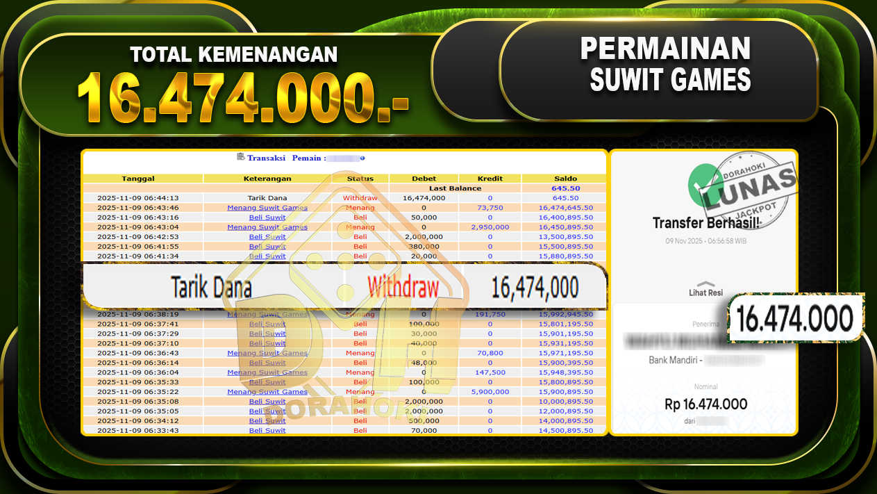 Bukti JP Suwit Games – ucapkan selamat kepada user id gooxxx atas kemenangan di Suwit Games dengan total kemenangan Rp.16,474,000 ,- . Yang pasti nya langsung LUNAS sesuai bukti ya bosku. Dofrahoki nih bosku berapapun akan tetap kami bayar lunas ya bosku.