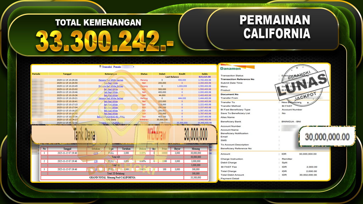 Bukti JP CALIFORNIA – ucapkan selamat kepada user id henxxxx atas kemenangan di CALIFORNIA dengan total kemenangan Rp.33.300.242,- . Yang pasti nya langsung LUNAS sesuai bukti ya bosku. Dorahoki nih bosku berapapun akan tetap kami bayar lunas ya bosku.