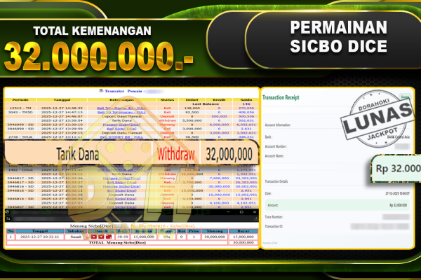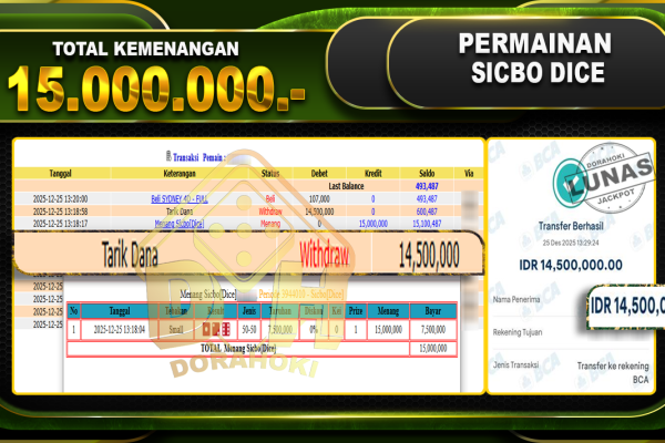 Bukti JP Sicbo Dice – ucapkan selamat kepada user id antxxx atas kemenangan di Sicbo Dice dengan total kemenangan Rp.14.700.000,- Yang pasti nya langsung LUNAS sesuai bukti ya bosku. Dorahoki nih bosku berapapun akan tetap kami bayar lunas ya bosku.