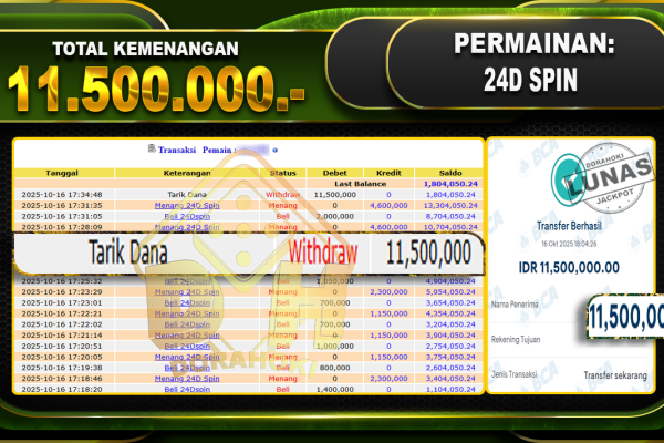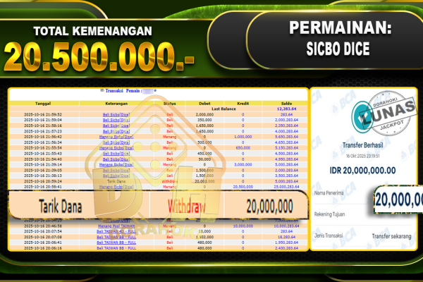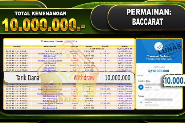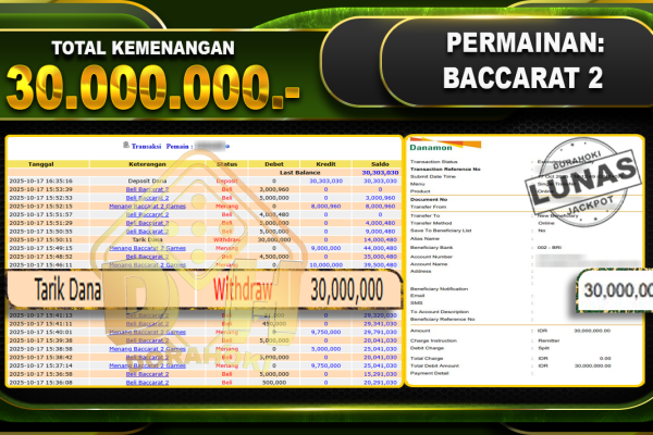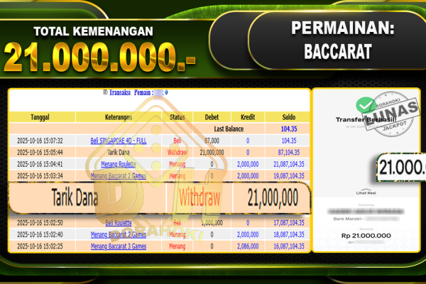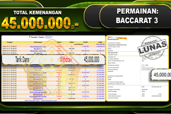 Bukti JP Baccarat 2 – ucapkan selamat kepada user id arkhxxxx atas kemenangan di Baccarat 2 dengan total kemenangan Rp.78.000.000- . Yang pasti nya langsung LUNAS sesuai bukti ya bosku. Dorahoki nih bosku berapapun akan tetap kami bayar lunas ya bosku.