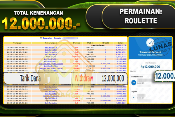 Bukti JP Roulette – ucapkan selamat kepada user id bandxxxxx atas kemenangan di Roulette dengan total kemenangan Rp.12.000.000,- Yang pasti nya langsung LUNAS sesuai bukti ya bosku. Dorahoki nih bosku berapapun akan tetap kami bayar lunas ya bosku.