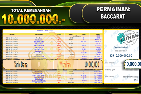 Bukti JP BACCARAT 3 GAMES – ucapkan selamat kepada user id arkhxxxx atas kemenangan di BACCARAT 3 GAMES dengan total kemenangan Rp.10.000.000,- . Yang pasti nya langsung LUNAS sesuai bukti ya bosku. Dorahoki nih bosku berapapun akan tetap kami bayar lunas ya bosku.