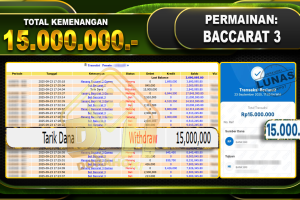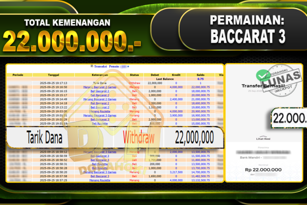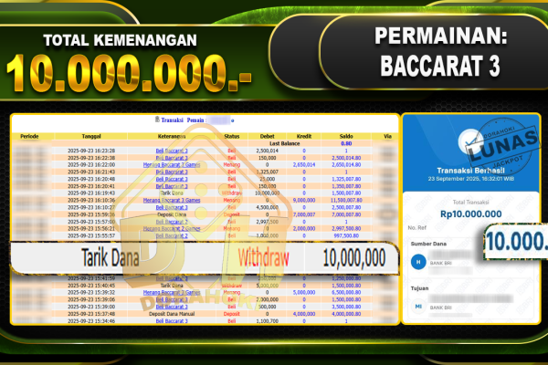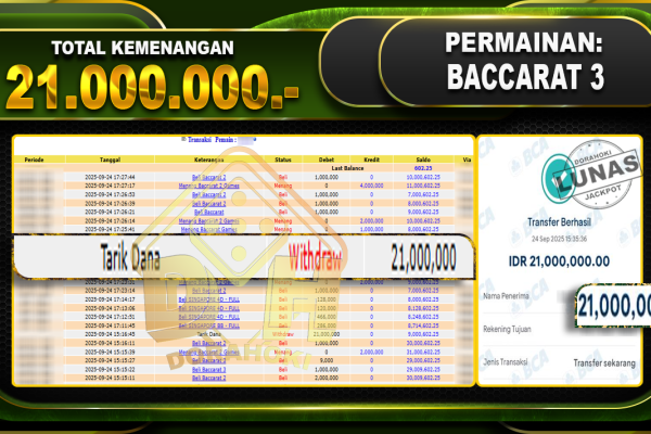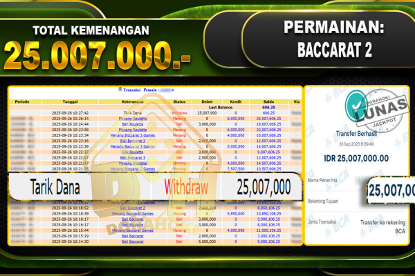 Bukti JP BACCARAT 2 GAMES- ucapkan selamat kepada user id asuxxxx atas kemenangan di BACCARAT 2 GAMES dengan total kemenangan Rp.25.007.000,- . Yang pasti nya langsung LUNAS sesuai bukti ya bosku. Dorahoki nih bosku berapapun akan tetap kami bayar lunas ya bosku.