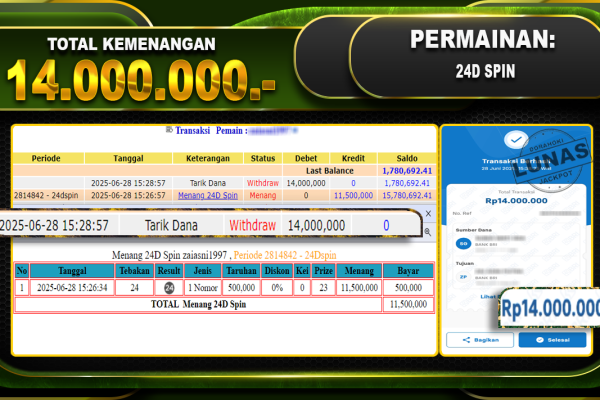 Bukti JP 24D Spin – ucapkan selamat kepada user id Zaixxx atas kemenangan di 24D Spin dengan total kemenangan Rp.18.400.400,- . Yang pasti nya langsung LUNAS sesuai bukti ya bosku. Dorahoki nih bosku berapapun akan tetap kami bayar lunas ya bosku.