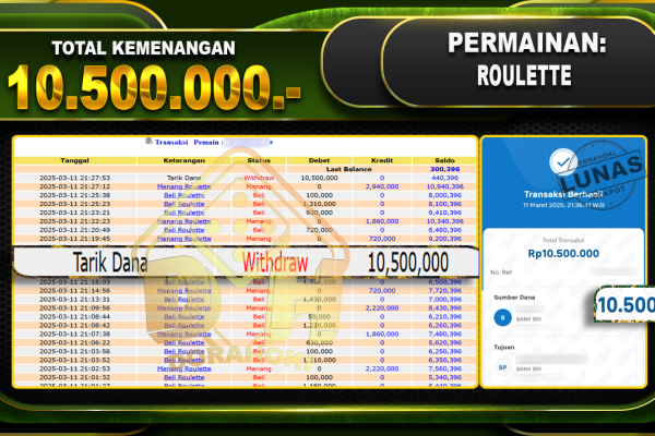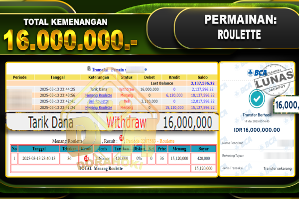 Bukti JP ROULETTE GAMES – ucapkan selamat kepada user id Arwxxx atas kemenangan di ROULETTE GAMES dengan total kemenangan Rp.16.000.000,- . Yang pasti nya langsung LUNAS sesuai bukti ya bosku. Dorahoki nih bosku berapapun akan tetap kami bayar lunas ya bosku. Kami mengucapkan Terima Kasih telah mempercayakan DORAHOKI sebagai Bandar Online pilihan dalam bermain judi online….
