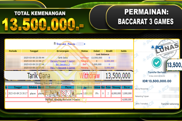 Bukti JP BACCARAT 2 GAMES – ucapkan selamat kepada user id Wahxxx atas kemenangan di BACCARAT 2 GAMES dengan total kemenangan Rp.14.750.000,- . Yang pasti nya langsung LUNAS sesuai bukti ya bosku. Dorahoki nih bosku berapapun akan tetap kami bayar lunas ya bosku. Kami mengucapkan Terima Kasih telah mempercayakan DORAHOKI sebagai Bandar Online pilihan dalam bermain…