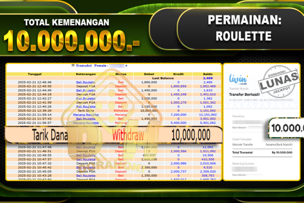Bukti JP ROULETTE GAMES – ucapkan selamat kepada user id Omaxxx atas kemenangan di ROULETTE GAMES dengan total kemenangan Rp.10.000.000,- . Yang pasti nya langsung LUNAS sesuai bukti ya bosku. Dorahoki nih bosku berapapun akan tetap kami bayar lunas ya bosku. Kami mengucapkan Terima Kasih telah mempercayakan DORAHOKI sebagai Bandar Online pilihan dalam bermain judi online….