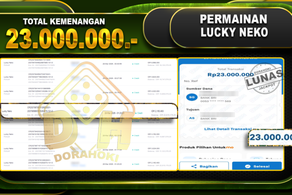 Bukti JP Lucky Neko – ucapkan selamat kepada user id Aaaxxxxx atas kemenangan di Lucky Neko dengan total kemenangan Rp.23.000.000,- Yang pasti nya langsung LUNAS Sesuai Bukti. Kemenangan Berapapun Situs DoraHoki Akan Membayar Lunas ya