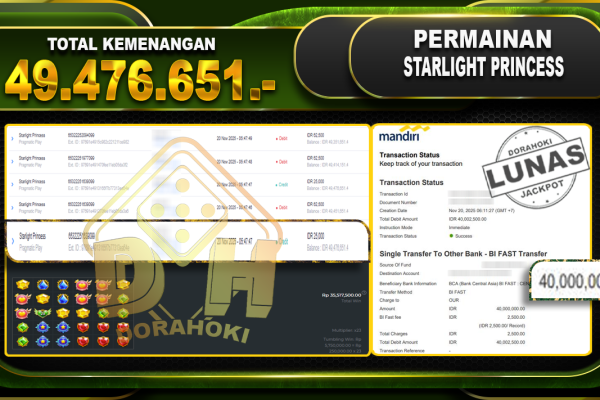 Bukti JP Starlight Princess – Kami ucapkan selamat kepada user id alixxxxx atas kemenangan di Starlight Princess dengan total kemenangan Rp.49,476,651,- . Yang pasti nya langsung LUNAS sesuai bukti ya bosku. Dorahoki nih bosku berapapun akan tetap kami bayar lunas ya bosku. Kami mengucapkan Terima Kasih telah mempercayakan DORAHOKI sebagai Bandar Online pilihan dalam bermain judi…