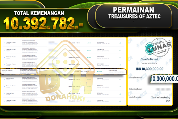 Bukti JP Treasures of Aztec- Selamat Kepada User ID : Bocxxxxx atas kemenangan Treasures of Aztec Dengan Nominal Sebesar Rp.10.392.782,- . Yang pasti nya langsung LUNAS Sesuai Bukti. Kemenangan Berapapun Situs DoraHoki Akan Membayar Lunas ya