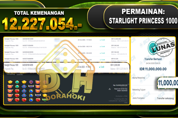Bukti JP Starlight Princess 1000 – ucapkan selamat kepada user id gabxxxxx atas kemenangan di Starlight Princess 1000 dengan total kemenangan Rp.12,227,054,- Yang pasti nya langsung LUNAS sesuai bukti ya bosku. Dorahoki nih bosku berapapun akan tetap kami bayar lunas ya bosku