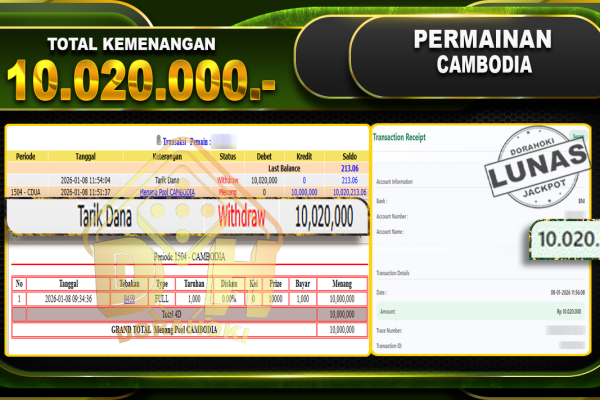Bukti JP TOGEL CAMBODIA – ucapkan selamat kepada user id jawxxx atas kemenangan di  TOGEL CAMBODIA dengan total kemenangan Rp.10.020.000,- Yang pasti nya langsung LUNAS sesuai bukti ya bosku. Dorahoki nih bosku berapapun akan tetap kami bayar lunas ya bosku