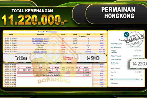 Bukti JP TOGEL HONGKONG – ucapkan selamat kepada user id limxxxxx atas kemenangan di TOGEL HONGKONG dengan total kemenangan Rp.11.220.000,- . Yang pasti nya langsung LUNAS sesuai bukti ya bosku. Dorahoki nih bosku berapapun akan tetap kami bayar lunas ya bosku. Kami mengucapkan Terima Kasih telah mempercayakan DORAHOKI sebagai Bandar Online pilihan dalam bermain judi online….