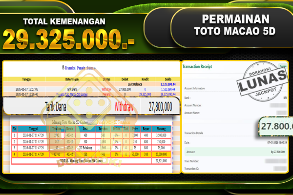 Bukti JP TOGEL Toto Macau 5D Games – ucapkan selamat kepada user id husxx atas kemenangan di  TOGEL Toto Macau 5D Games  dengan total kemenangan Rp.29.325.000,- Yang pasti nya langsung LUNAS sesuai bukti ya bosku. Dorahoki nih bosku berapapun akan tetap kami bayar lunas ya bosku.