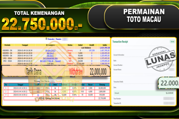 Bukti JP TOGEL TOTO MACAU 4D – ucapkan selamat kepada user id rotxxxx atas kemenangan di  TOGEL TOTO MACAU 4D dengan total kemenangan Rp.22.750.000,- Yang pasti nya langsung LUNAS sesuai bukti ya bosku. Dorahoki nih bosku berapapun akan tetap kami bayar lunas ya bosku