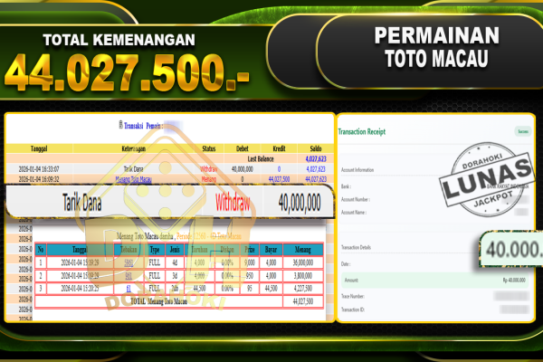 Bukti JP TOGEL TOTO MACAU 4D – ucapkan selamat kepada user id damxx atas kemenangan di  TOGEL TOTO MACAU 4D dengan total kemenangan Rp.44.027.500,- Yang pasti nya langsung LUNAS sesuai bukti ya bosku. Dorahoki nih bosku berapapun akan tetap kami bayar lunas ya bosku