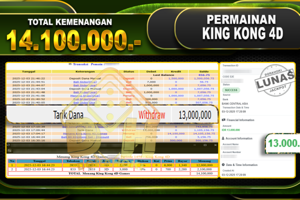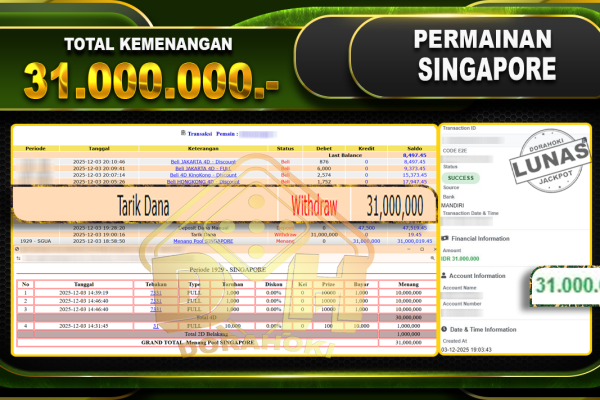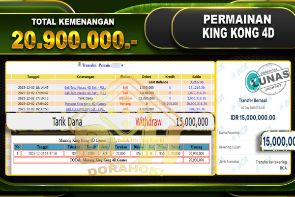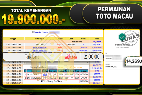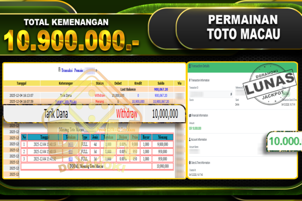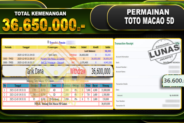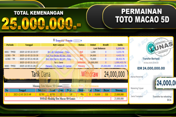 Bukti JP TOGEL Toto Macao 5D Games – ucapkan selamat kepada user id bbyxxx atas kemenangan di TOGEL Toto Macao 5D Games dengan total kemenangan Rp.25.000.000,- Yang pasti nya langsung LUNAS sesuai bukti ya bosku. Dorahoki nih bosku berapapun akan tetap kami bayar lunas ya bosku.
