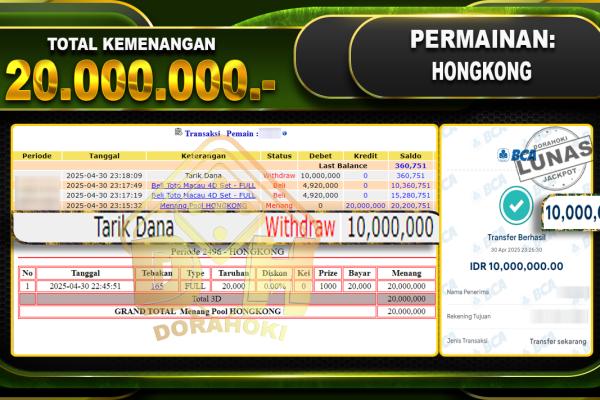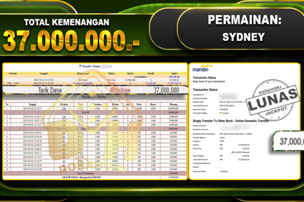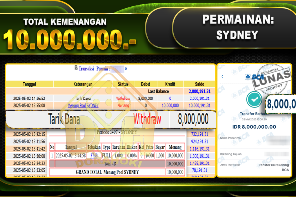 Bukti JP TOGEL SYDNEY – ucapkan selamat kepada user id 148xxx atas kemenangan di TOGEL SYDNEY dengan total kemenangan Rp.10.000.000,- . Yang pasti nya langsung LUNAS sesuai bukti ya bosku. Dorahoki nih bosku berapapun akan tetap kami bayar lunas ya bosku. Kami mengucapkan Terima Kasih telah mempercayakan DORAHOKI sebagai Bandar Online pilihan dalam bermain judi…