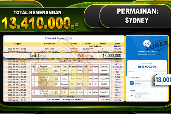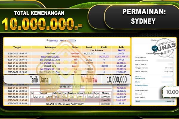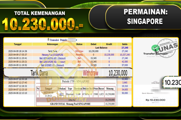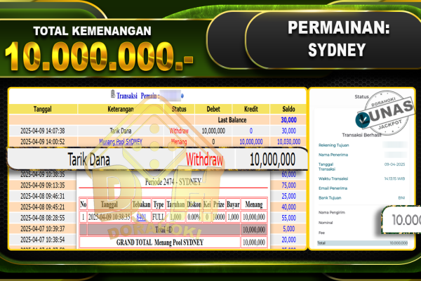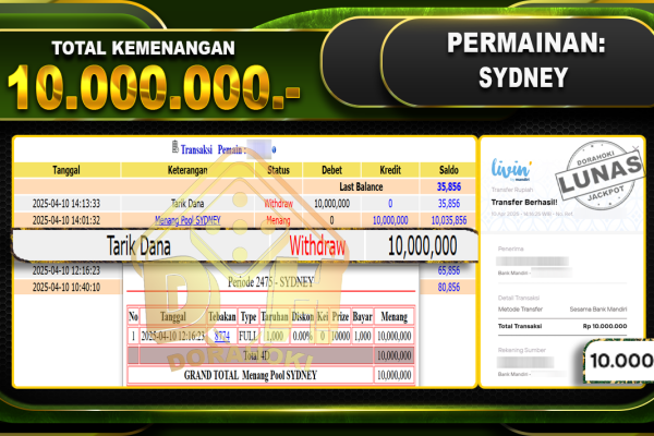 Bukti JP TOGEL SYDNEY – ucapkan selamat kepada user id Xiaxxx atas kemenangan di TOGEL SYDNEY dengan total kemenangan Rp.10.000.000,- . Yang pasti nya langsung LUNAS sesuai bukti ya bosku. Dorahoki nih bosku berapapun akan tetap kami bayar lunas ya bosku. Kami mengucapkan Terima Kasih telah mempercayakan DORAHOKI sebagai Bandar Online pilihan dalam bermain judi…