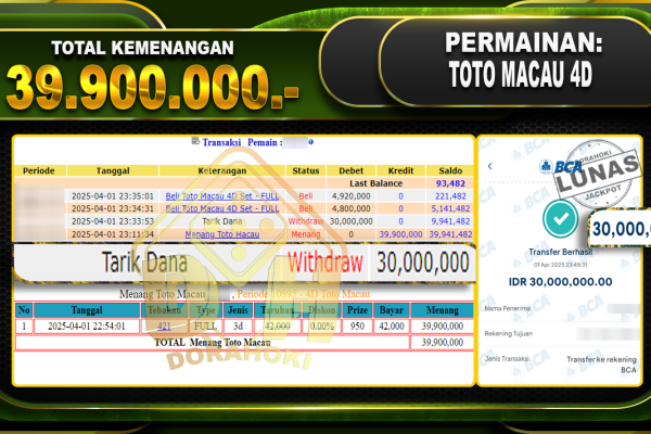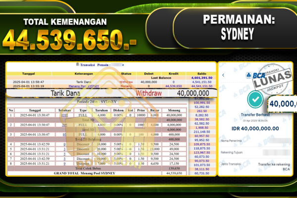 Bukti JP TOGEL SYDNEY – ucapkan selamat kepada user id Sonxxx atas kemenangan di  TOGEL SYDNEY  dengan total kemenangan Rp.44.539.650,- . Yang pasti nya langsung LUNAS sesuai bukti ya bosku. Dorahoki nih bosku berapapun akan tetap kami bayar lunas ya bosku. Kami mengucapkan Terima Kasih telah mempercayakan DORAHOKI sebagai Bandar Online pilihan dalam bermain judi…