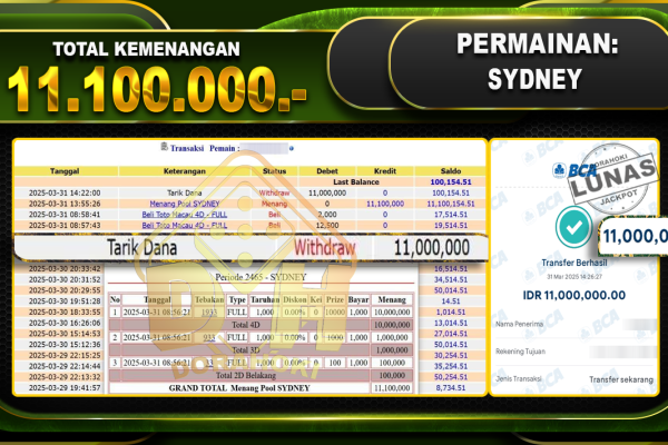 Bukti JP TOGEL SYDNEY – ucapkan selamat kepada user id Narxxx atas kemenangan di  TOGEL SYDNEY  dengan total kemenangan Rp.11.100.000,- . Yang pasti nya langsung LUNAS sesuai bukti ya bosku. Dorahoki nih bosku berapapun akan tetap kami bayar lunas ya bosku. Kami mengucapkan Terima Kasih telah mempercayakan DORAHOKI sebagai Bandar Online pilihan dalam bermain judi…