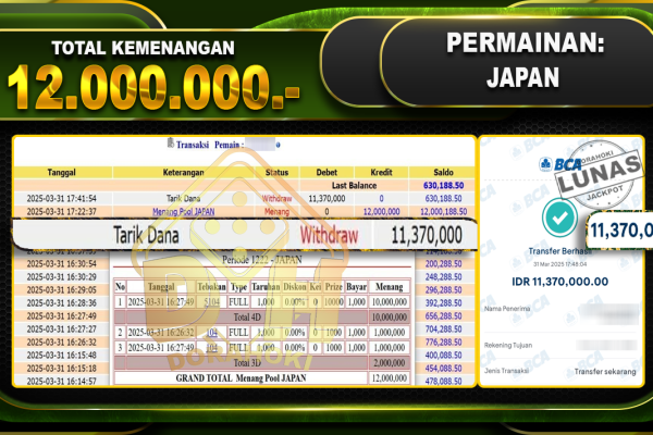 Bukti JP TOGEL JAPAN- ucapkan selamat kepada user id Tosxxx atas kemenangan di  TOGEL JAPAN  dengan total kemenangan Rp.12.000.000,- . Yang pasti nya langsung LUNAS sesuai bukti ya bosku. Dorahoki nih bosku berapapun akan tetap kami bayar lunas ya bosku. Kami mengucapkan Terima Kasih telah mempercayakan DORAHOKI sebagai Bandar Online pilihan dalam bermain judi online….