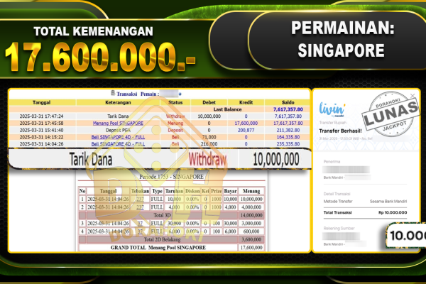 Bukti JP TOGEL SINGAPORE – ucapkan selamat kepada user id Lanxxx atas kemenangan di  TOGEL SINGAPORE  dengan total kemenangan Rp.17.000.000,- . Yang pasti nya langsung LUNAS sesuai bukti ya bosku. Dorahoki nih bosku berapapun akan tetap kami bayar lunas ya bosku. Kami mengucapkan Terima Kasih telah mempercayakan DORAHOKI sebagai Bandar Online pilihan dalam bermain judi online….