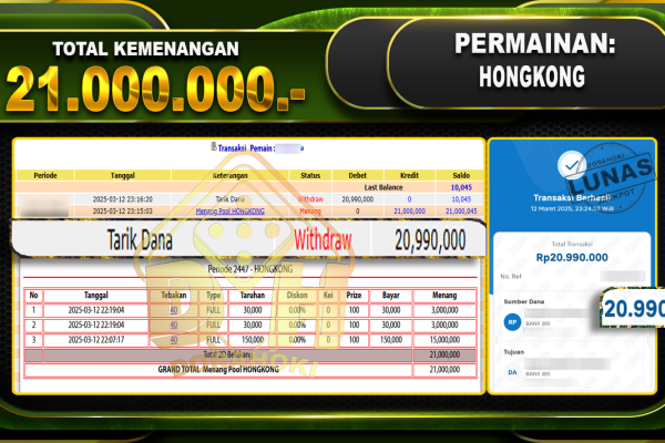 Bukti JP TOGEL HONGKONG – ucapkan selamat kepada user id Udixxx atas kemenangan di TOGEL HONGKONG dengan total kemenangan Rp.11.100.000,- . Yang pasti nya langsung LUNAS sesuai bukti ya bosku. Dorahoki nih bosku berapapun akan tetap kami bayar lunas ya bosku. Kami mengucapkan Terima Kasih telah mempercayakan DORAHOKI sebagai Bandar Online pilihan dalam bermain judi…