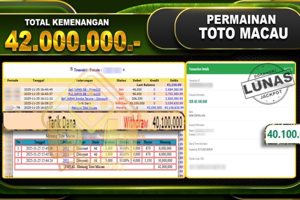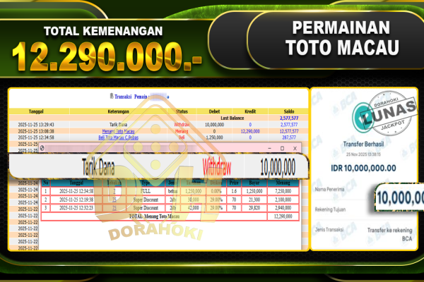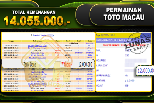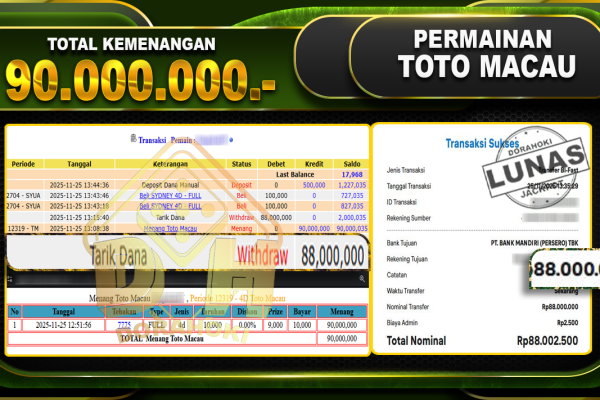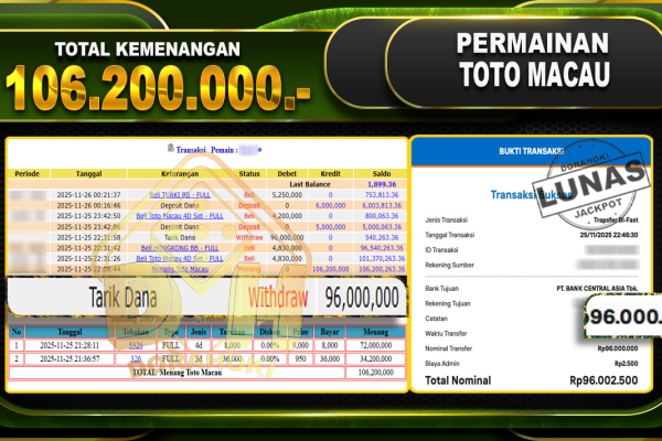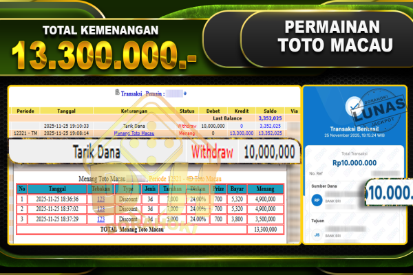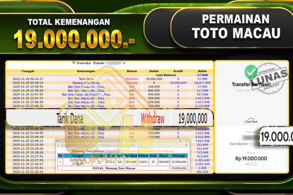Bukti JP TOGEL TOTO MACAU 4D – ucapkan selamat kepada user id lenxxxxx atas kemenangan di TOGEL TOTO MACAU 4D dengan total kemenangan Rp.19,000,000,- Yang pasti nya langsung LUNAS sesuai bukti ya bosku. Dorahoki nih bosku berapapun akan tetap kami bayar lunas ya bosku