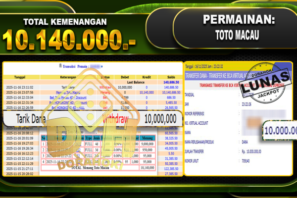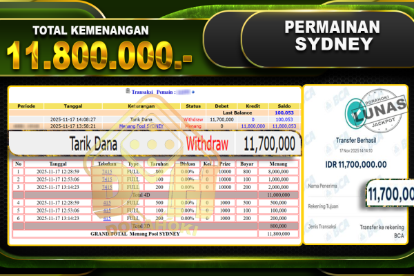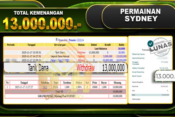 Bukti JP TOGEL SYDNEY – ucapkan selamat kepada user id gagxxxxx atas kemenangan di TOGEL SYDNEY dengan total kemenangan Rp.11,000,000,- Yang pasti nya langsung LUNAS sesuai bukti ya bosku. Dorahoki nih bosku berapapun akan tetap kami bayar lunas ya bosku