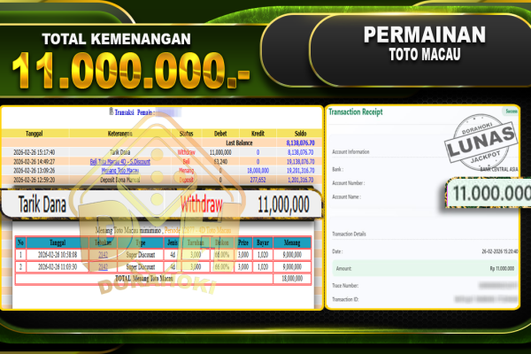 Bukti JP TOGEL Toto Macau 5D Games – Selamat Kepada User ID : Stexxxx atas kemenangan TOGEL Toto Macau 5D Games Dengan Nominal Sebesar Rp.14.700.000,- Yang pasti nya langsung LUNAS Sesuai Bukti. Kemenangan Berapapun Situs DoraHoki Akan Membayar Lunas ya