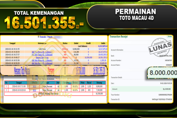 Bukti JP TOGEL TOTO MACAU – Selamat Kepada User ID : Kurxxx atas kemenangan TOGEL TOTO MACAU Dengan Nominal Sebesar Rp. 10.000.000,- . Yang pasti nya langsung LUNAS Sesuai Bukti. Kemenangan Berapapun Situs DoraHoki Akan Membayar Lunas ya Kami mengucapkan Terima Kasih telah mempercayakan DORAHOKI sebagai Bandar Online pilihan dalam bermain judi online. Semoga bosku bisa…