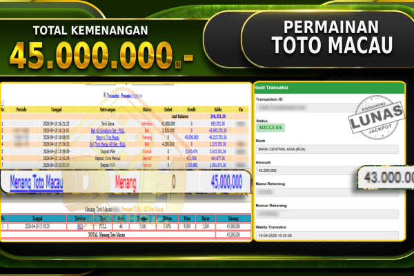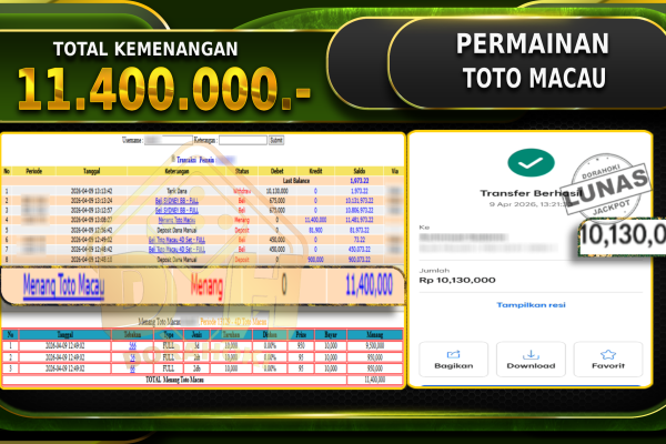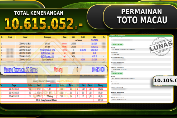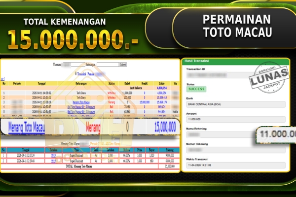 Bukti JP TOGEL Toto Macau – Selamat Kepada User ID : Ahuxxxx atas kemenangan TOGEL Toto Macau Dengan Nominal Sebesar Rp.15.000.000,- Yang pasti nya langsung LUNAS Sesuai Bukti. Kemenangan Berapapun Situs DoraHoki Akan Membayar Lunas ya