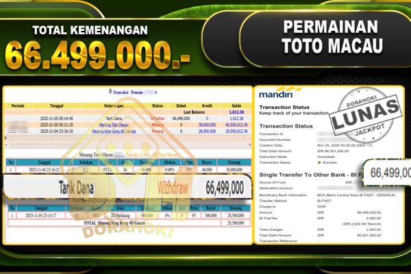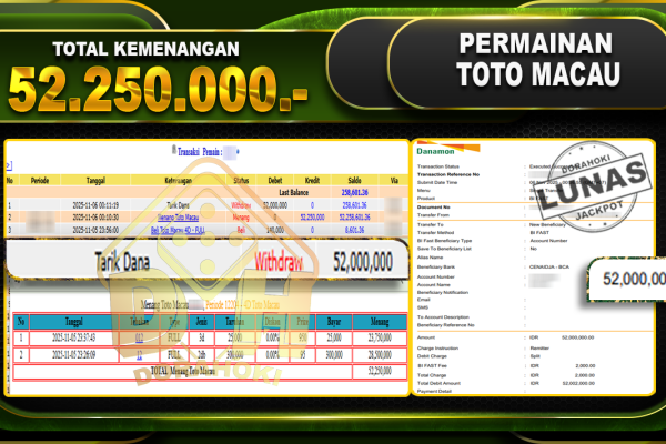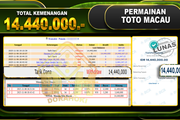 Bukti JP TOGEL TOTO MACAU 4D – ucapkan selamat kepada user id hjbxxx atas kemenangan di TOGEL TOTO MACAU 4D dengan total kemenangan Rp.10,045,000,- Yang pasti nya langsung LUNAS sesuai bukti ya bosku. Dorahoki nih bosku berapapun akan tetap kami bayar lunas ya bosku