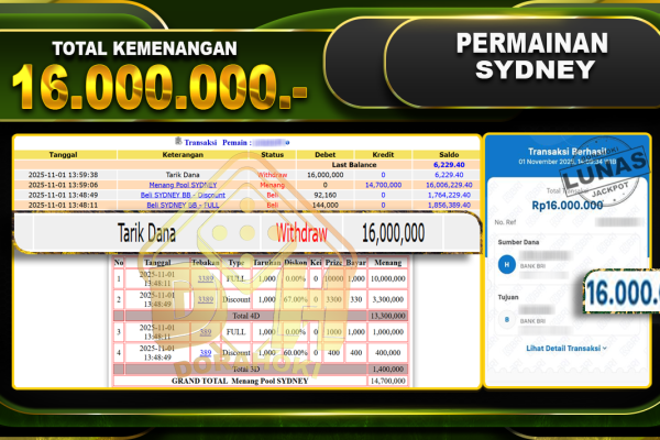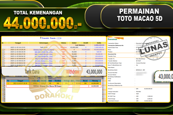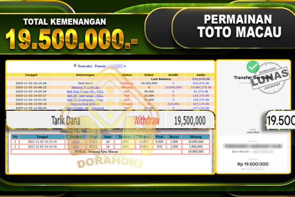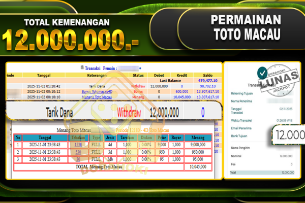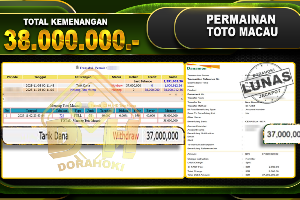 Bukti JP TOGEL TOTO MACAU 4D – ucapkan selamat kepada user id busxxx atas kemenangan di TOGEL TOTO MACAU 4D dengan total kemenangan Rp.38,000,000,- Yang pasti nya langsung LUNAS sesuai bukti ya bosku. Dorahoki nih bosku berapapun akan tetap kami bayar lunas ya bosku