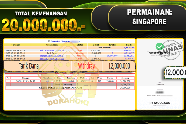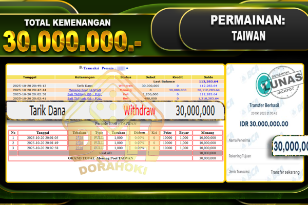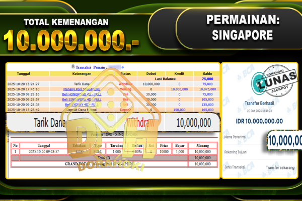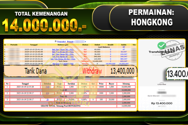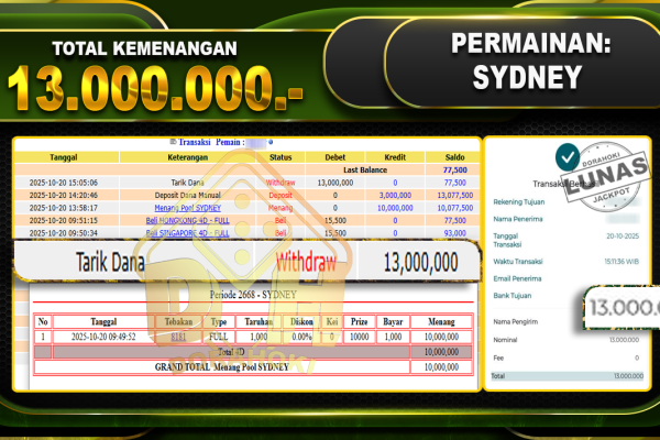 Bukti JP TOGEL SYDNEY – ucapkan selamat kepada user id jhgxxxx atas kemenangan di TOGEL SYDNEY dengan total kemenangan Rp.13,000,000,- Yang pasti nya langsung LUNAS sesuai bukti ya bosku. Dorahoki nih bosku berapapun akan tetap kami bayar lunas ya bosku
