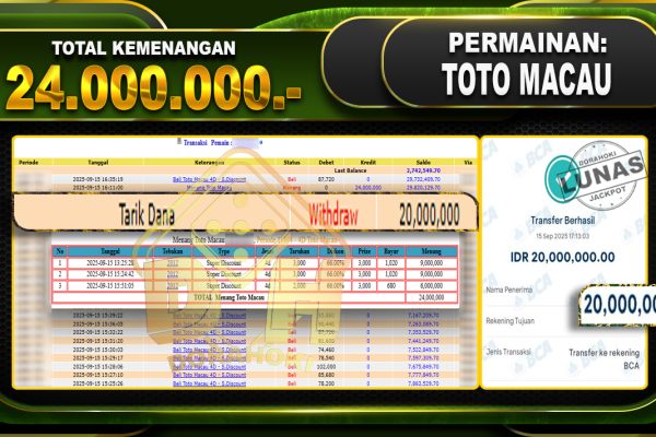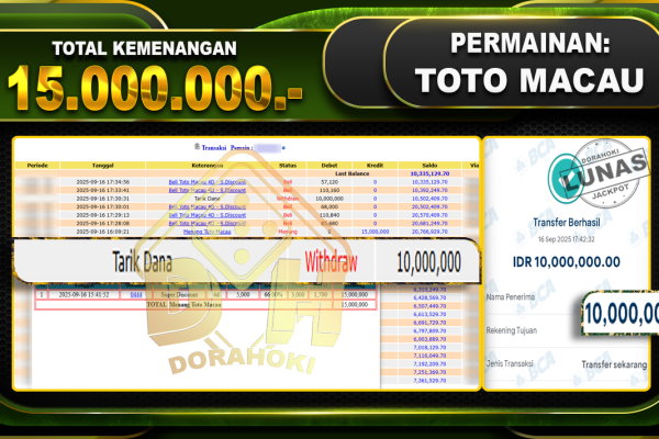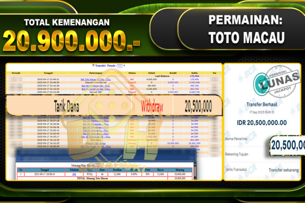 Bukti JP TOGEL TOTO MACAU – ucapkan selamat kepada user id Buxxx atas kemenangan di TOGEL TOTO MACAU dengan total kemenangan Rp.20,900,000,- Yang pasti nya langsung LUNAS sesuai bukti ya bosku. Dorahoki nih bosku berapapun akan tetap kami bayar lunas ya bosku