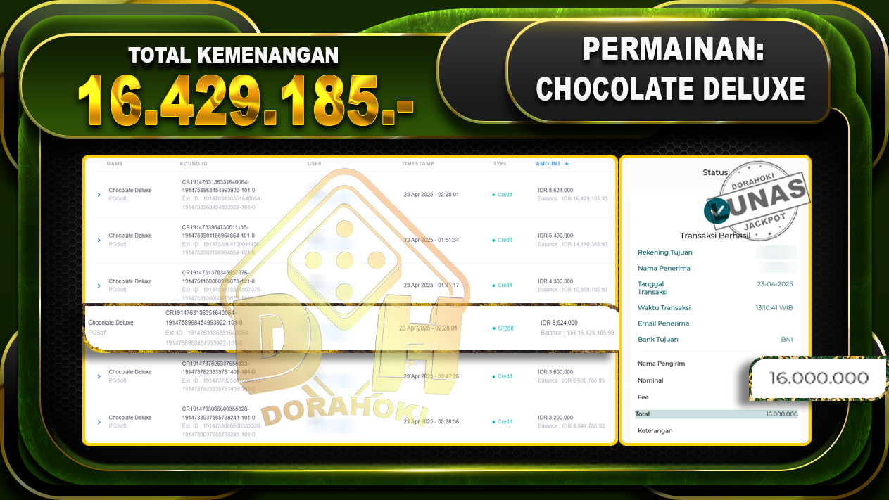 Bukti JP CHOCOLATE DELUXE – ucapkan selamat kepada user id Lopxxx atas kemenangan di CHOCOLATE DELUXE dengan total kemenangan Rp .16.429.185,- . Yang pasti nya langsung LUNAS sesuai bukti ya bosku. Dorahoki nih bosku berapapun akan tetap kami bayar lunas ya bosku.