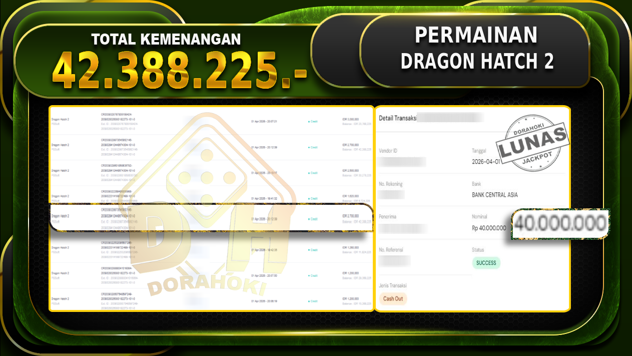 Bukti JP Dragon Hatch 2 – ucapkan selamat kepada user id Bolxxx atas kemenangan di Dragon Hatch 2 dengan total kemenangan Rp.42.388.225,- . Yang pasti nya langsung LUNAS Sesuai Bukti.
