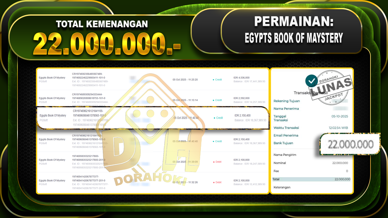 Bukti JP Egypts Book Of Mystery – ucapkan selamat kepada user id Lopxxxx atas kemenangan di Egypts Book Of Mystery dengan total kemenangan Rp.22,000,000,- . Yang pasti nya langsung LUNAS sesuai bukti ya bosku. Dorahoki nih bosku berapapun akan tetap kami bayar lunas ya bosku.