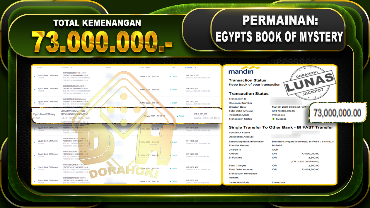 Bukti JP Egypts Book Of Mystery – ucapkan selamat kepada user id lopxxx atas kemenangan di Egypts Book Of Mystery dengan total kemenangan Rp.73,000,000,- . Yang pasti nya langsung LUNAS sesuai bukti ya bosku. Dorahoki nih bosku berapapun akan tetap kami bayar lunas ya bosku.