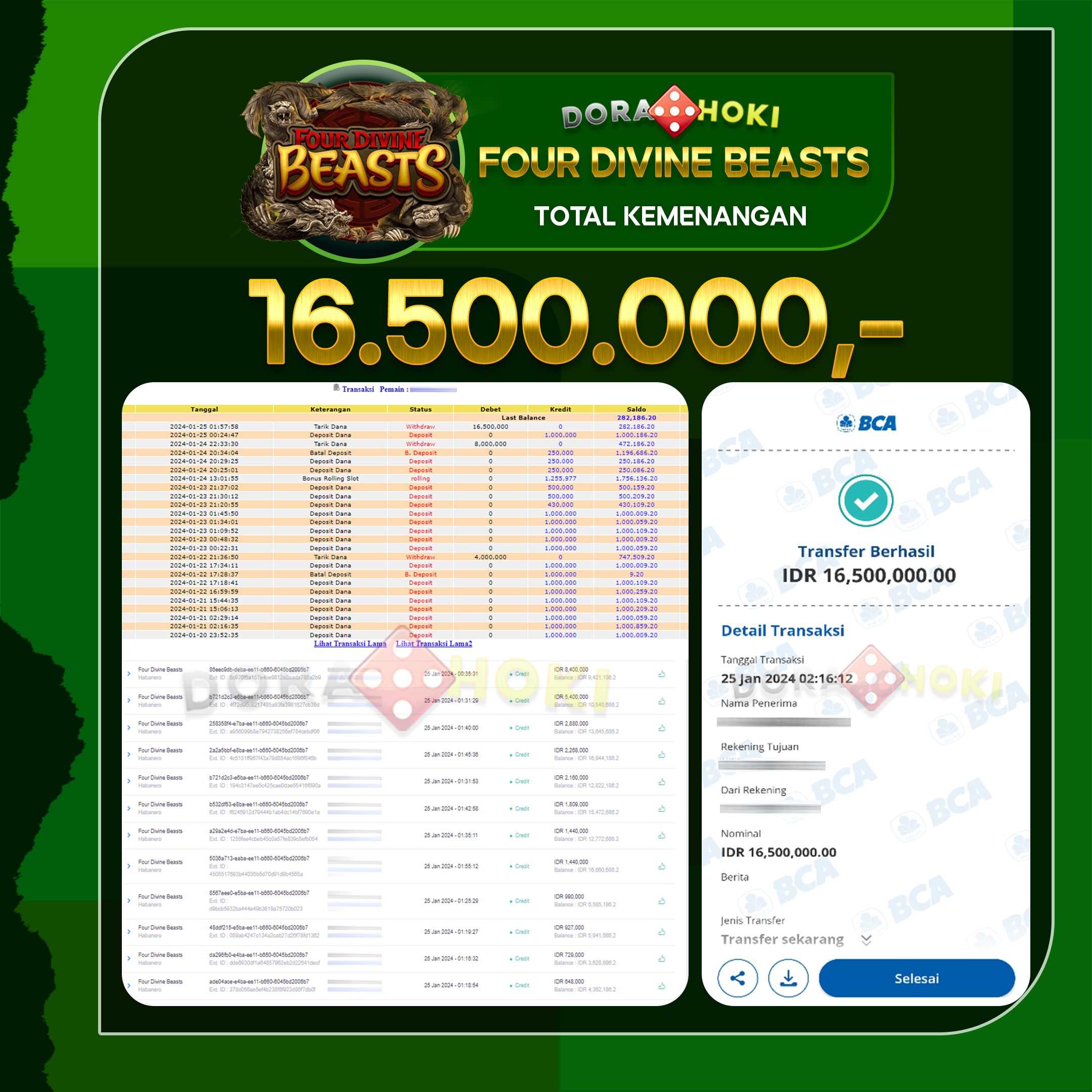 Bukti JP Four Divine Beasts – ucapkan selamat kepada user id Cheacxxx atas kemenangan di Four Divine Beasts dengan total kemenangan Rp.16,500,000,- . Yang pasti nya langsung LUNAS sesuai bukti ya bosku. Dorahoki nih bosku berapapun akan tetap kami bayar lunas ya bosku.