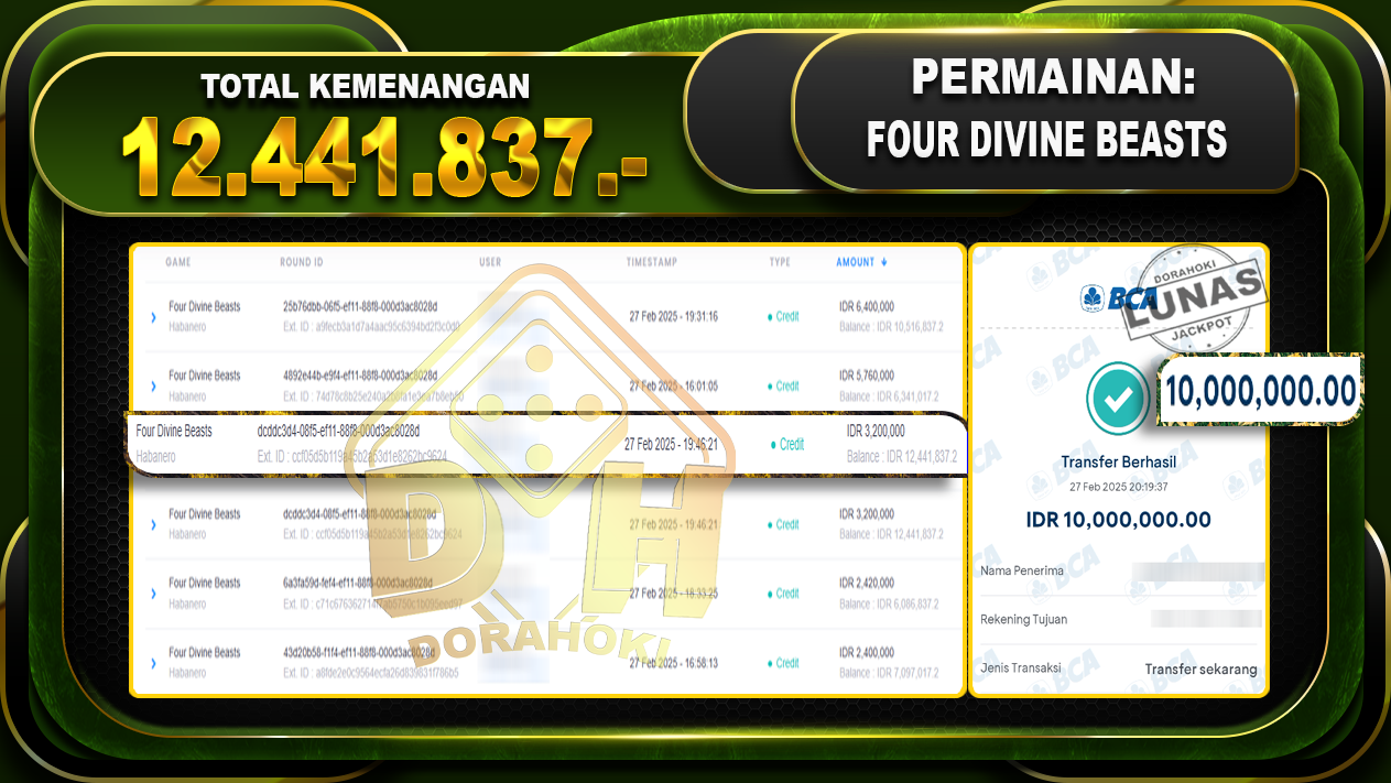 Bukti JP FOUR DIVINE BEASTS – ucapkan selamat kepada user id Chexxx atas kemenangan di FOUR DIVINE BEASTS dengan total kemenangan Rp.12.441.837,- . Yang pasti nya langsung LUNAS sesuai bukti ya bosku. Dorahoki nih bosku berapapun akan tetap kami bayar lunas ya bosku.